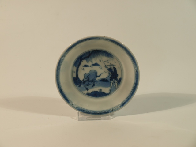 Twee schoteltjes van blauw Chinees porselein met Chinese visser