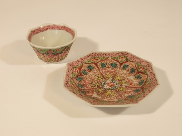 Drie achtkantige kleine kopjes en schoteltjes van gekleurd en geëmailleerd Chinees porselein