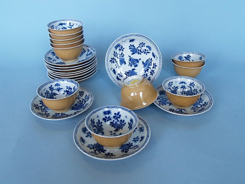 11 koppen en 12 schotels met decor van bloemen, café au lait, onderglazuurblauw