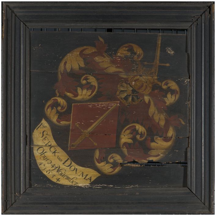 1. Bord (plateel, tin) met de afbeelding van een wapen. 2. Paneel waarop een of meer wapens met hun attributen zijn afgebeeld, van een of meer gestorvenen. Kon voor de kist uit worden gedragen en kreeg daarna een plaats aan de kerkmuur. Voor de reformatie gebruik van de adel, daarna overgenomen door de burgerij, maar nam af of verdween plaatselijk geheel. https://data.cultureelerfgoed.nl/term/id/cht/96227be1-0854-484e-b618-0b156967507a