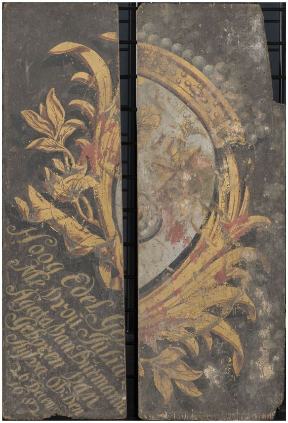 Ruitvormig wapenbord in twee losse delen met de naam van Julia Agata van Burmania