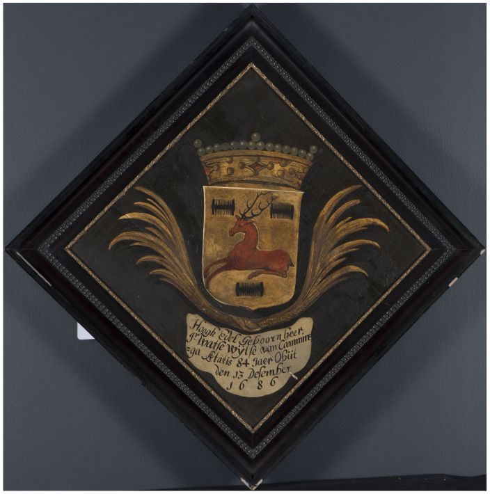1. Bord (plateel, tin) met de afbeelding van een wapen. 2. Paneel waarop een of meer wapens met hun attributen zijn afgebeeld, van een of meer gestorvenen. Kon voor de kist uit worden gedragen en kreeg daarna een plaats aan de kerkmuur. Voor de reformatie gebruik van de adel, daarna overgenomen door de burgerij, maar nam af of verdween plaatselijk geheel. https://data.cultureelerfgoed.nl/term/id/cht/96227be1-0854-484e-b618-0b156967507a