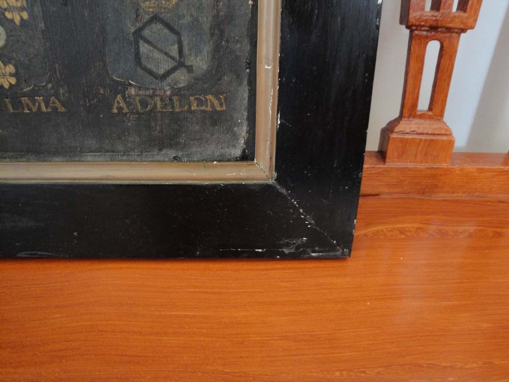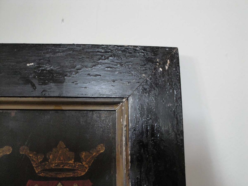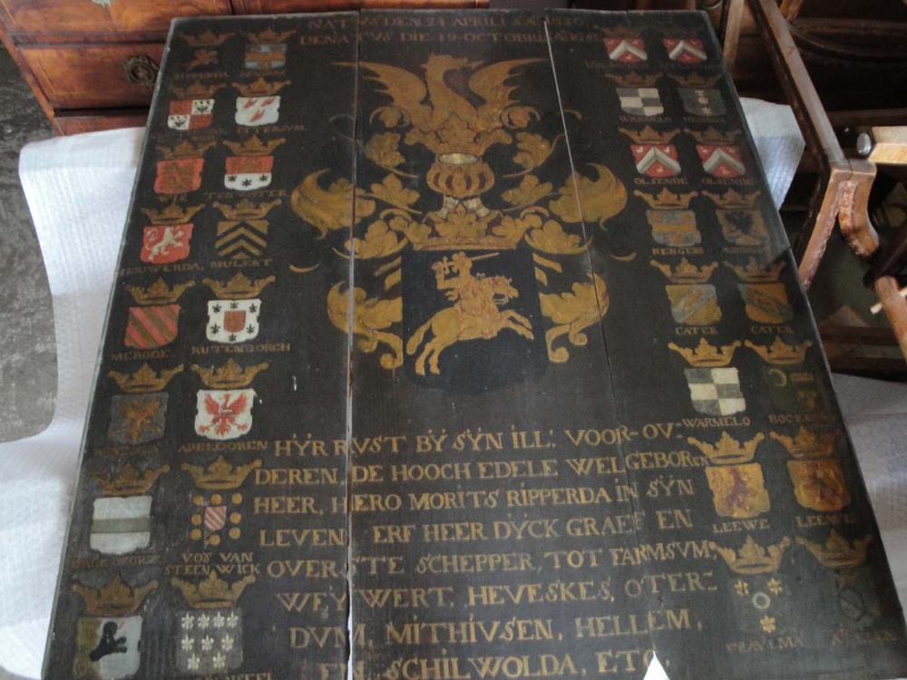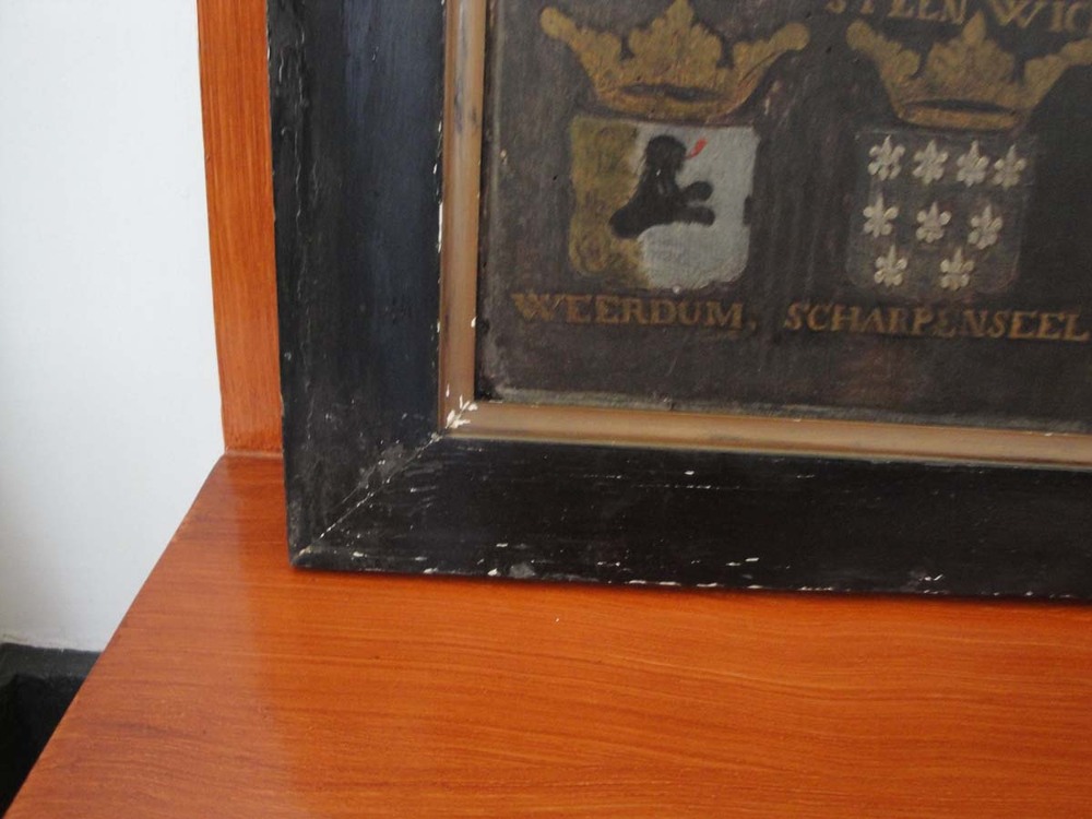 1. Bord (plateel, tin) met de afbeelding van een wapen. 2. Paneel waarop een of meer wapens met hun attributen zijn afgebeeld, van een of meer gestorvenen. Kon voor de kist uit worden gedragen en kreeg daarna een plaats aan de kerkmuur. Voor de reformatie gebruik van de adel, daarna overgenomen door de burgerij, maar nam af of verdween plaatselijk geheel. https://data.cultureelerfgoed.nl/term/id/cht/96227be1-0854-484e-b618-0b156967507a