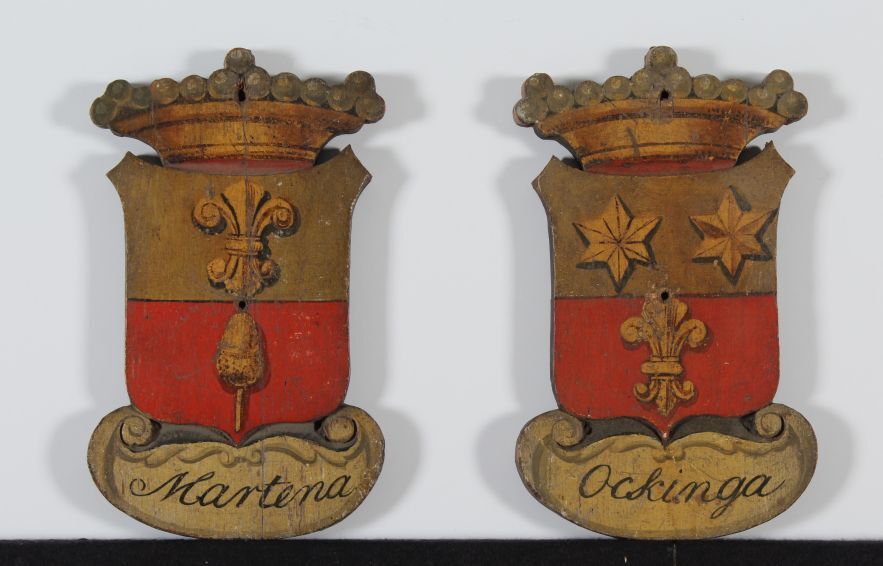 Wapenschildje met het wapen van Martena, onderdeel van twee wapenschildjes met wapens van Ockinga en Martena