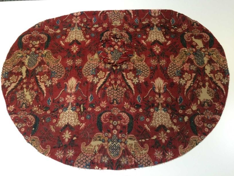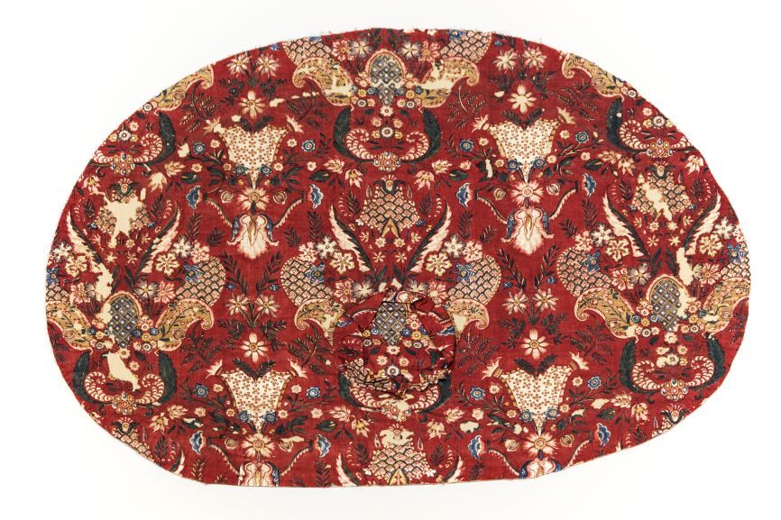 Sitsen zonhoedvoering, bedrukt met symmetrische motieven, geometrisch, omgeven door stijve bloemen en takjes, op rode grond