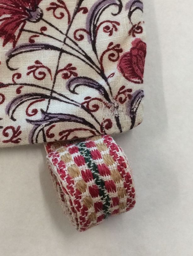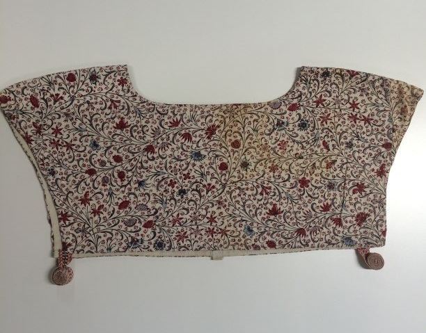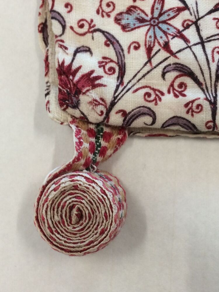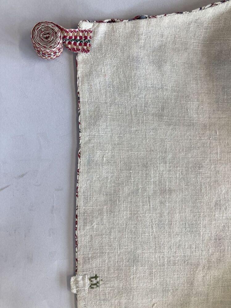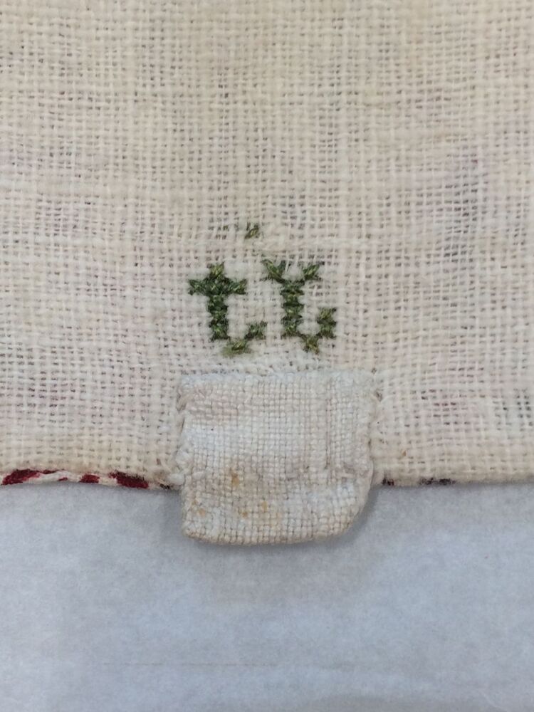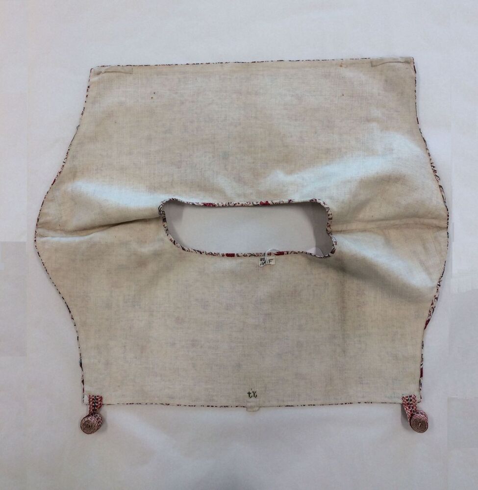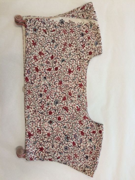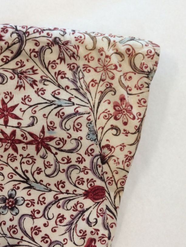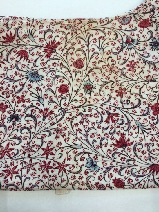 Sitsen vrouwenkroplap ofwel onderst, gemerkt TB. bedrukt met dunne ranken met smalle bladeren, bloemjes en krulletjes op witte grond