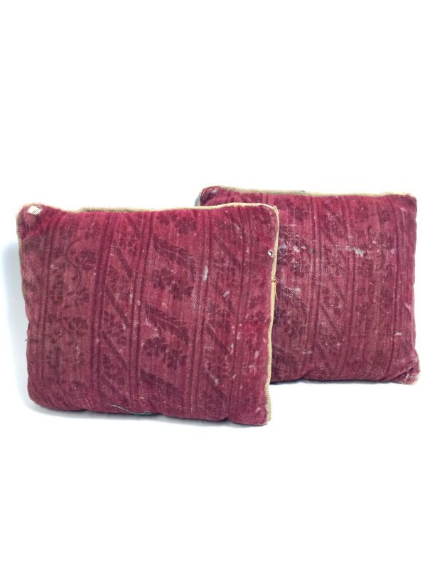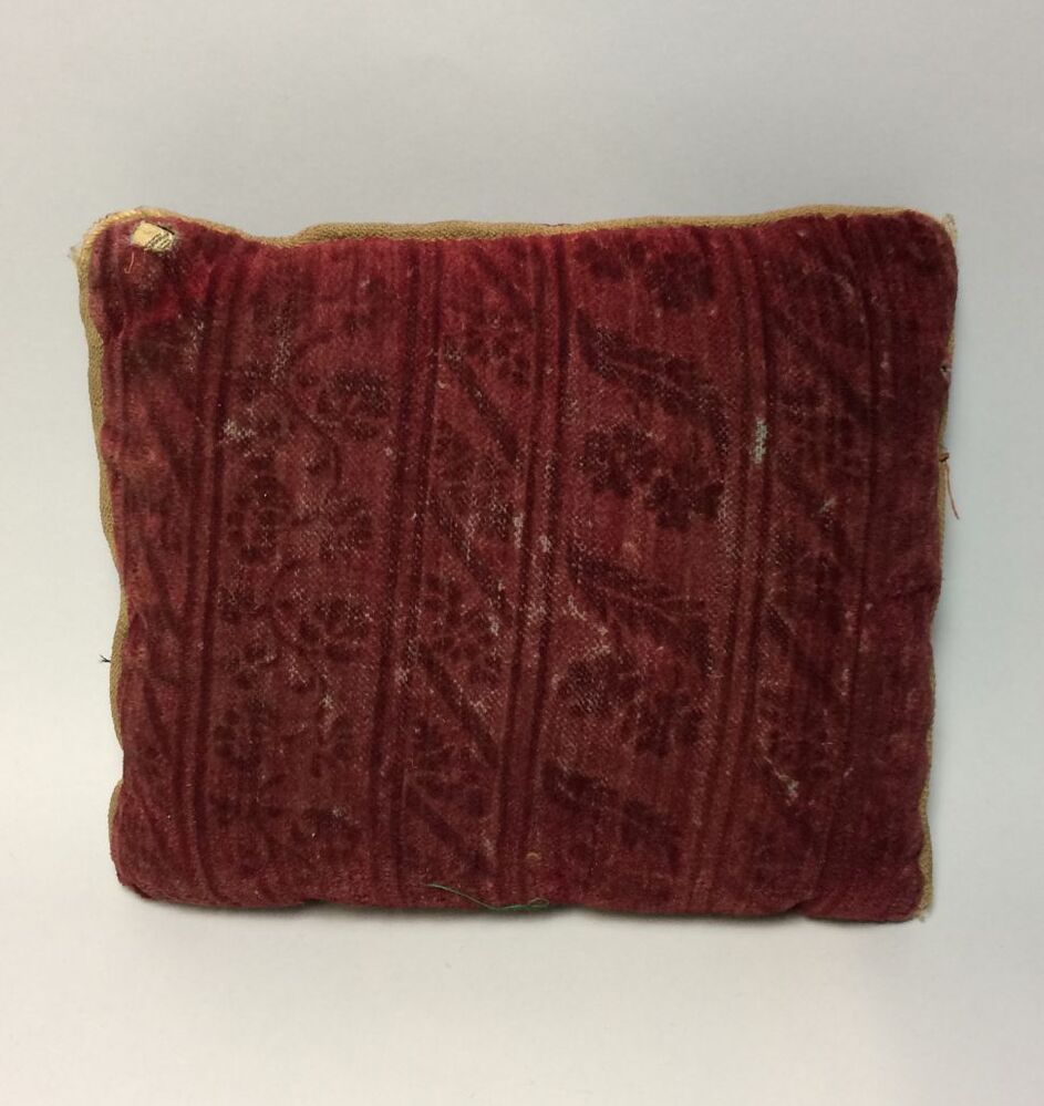 Kussentje van donker rode wollen velours, afgewerkt met gele bies, binnenkussen van blauw-wit gestreept linnen