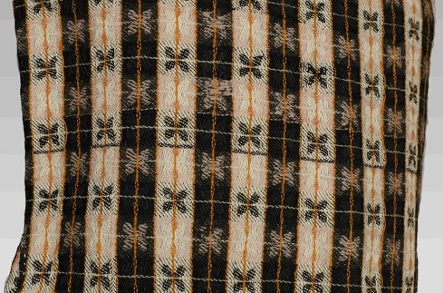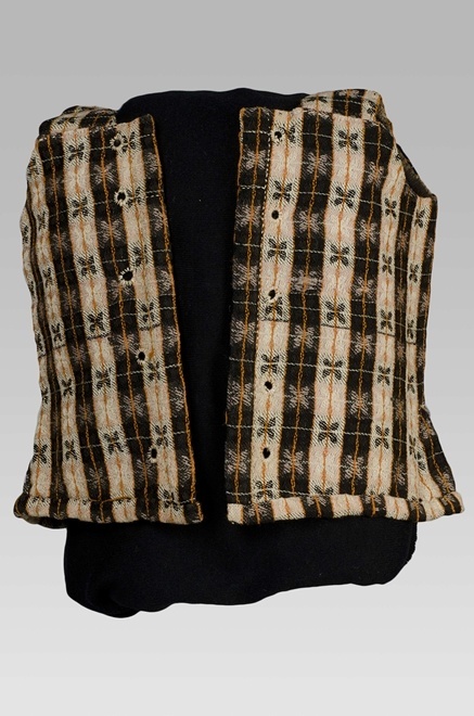 Lijfje van wol, doorregen met ruitjes en blaadjes in zwart-ecru-oranje met baleinen en twee keer vijf vetergaatjes