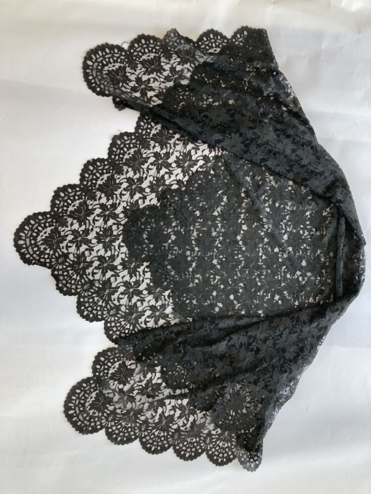 Omslagdoek van zwarte machinale kant, met grote bloemen