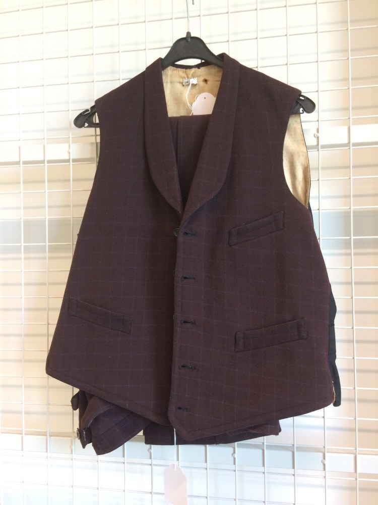 Mannenvest met sjaalkraag en enkele rij knopen van donkerrode wol met grijs ruitpatroon