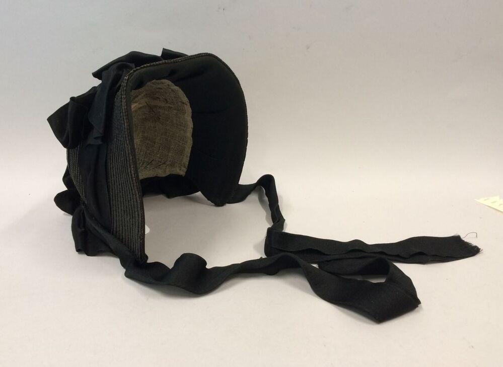 Luifelhoedje voor weesmeisje van zwart stroband met zijden linten