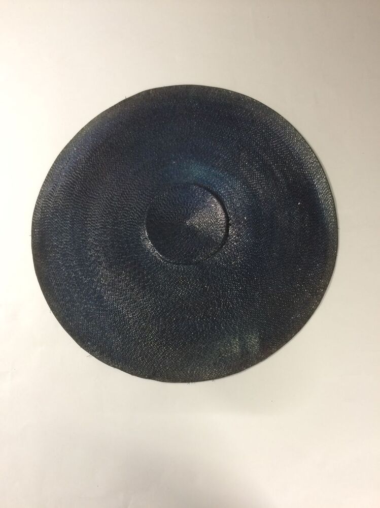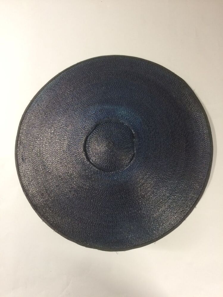 Platte hoed van donkerblauw zigzag stroband genaaid en omboord met zijden lint