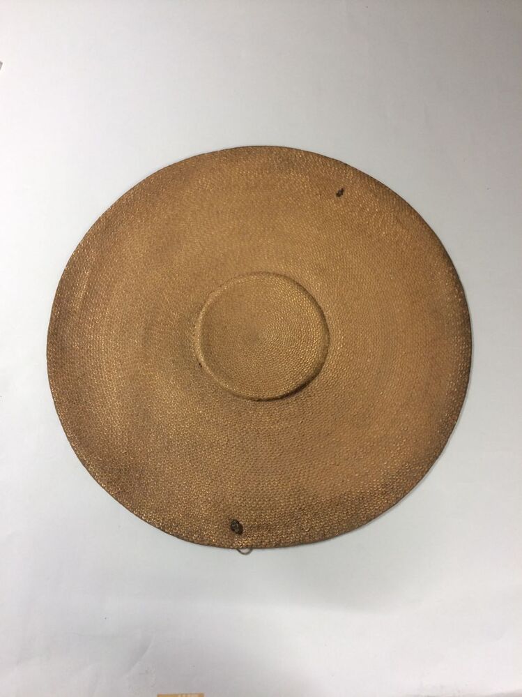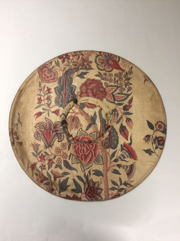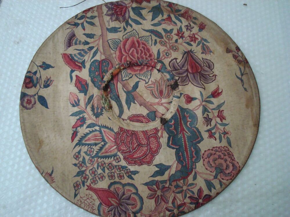 Platte zonhoed van zigzagstroband, geheel gevoerd met Indiase sits en restant van zijden lint