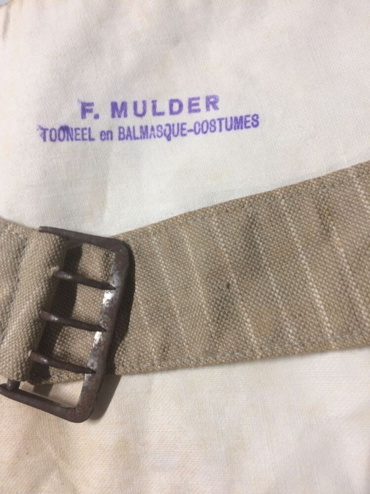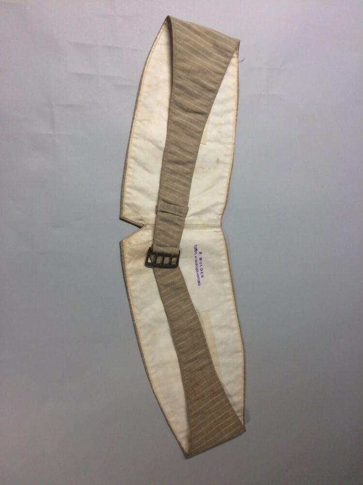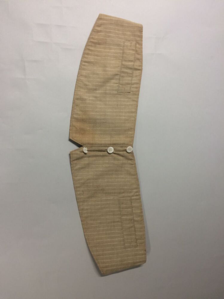 Vest, brede ceintuur van beige gestreepte katoen, drie knoopjes middenvoor, 'nep-vestje' met twee zakjes