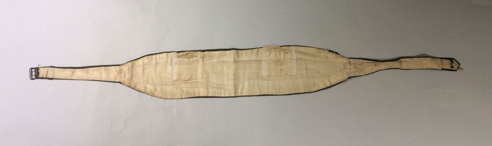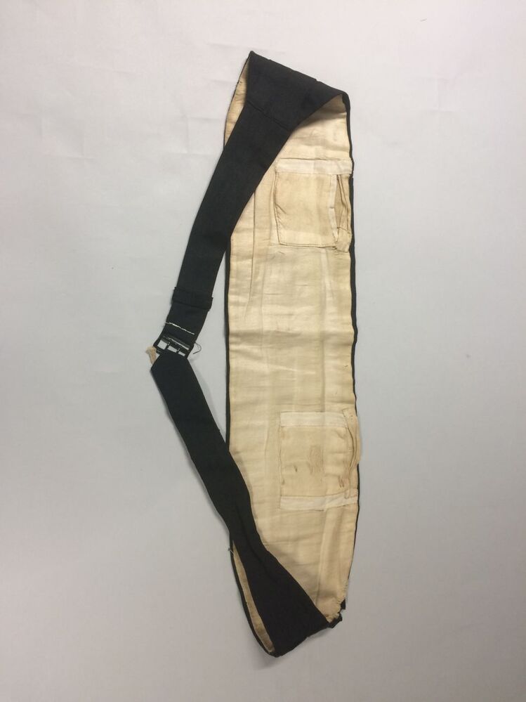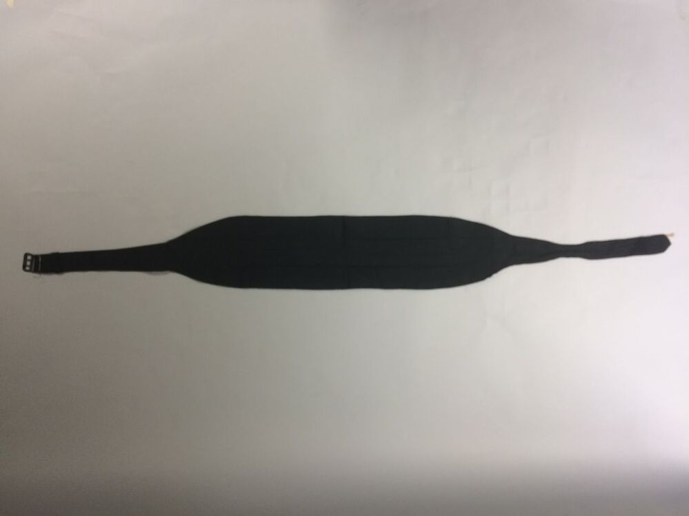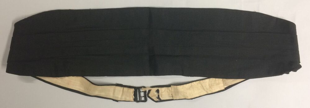 Cumberband, brede zwarte ribszijden ceintuur met gespsluiting middenachter en twee dwarse genaaide plooien met zakjes aan de binnenkant