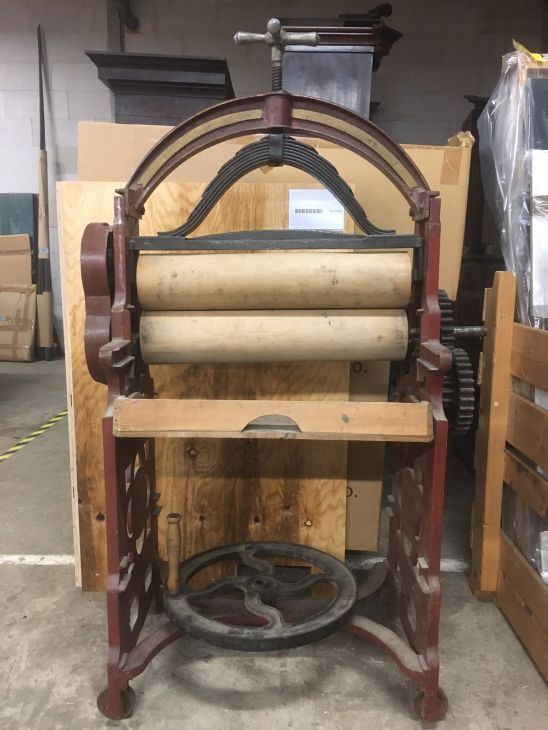 Donkerrode wringer met stabiele gietijzeren frame met verstelbaar veermechaniek bovenop, houten rollen en houten bak, met draaiwiel opzij