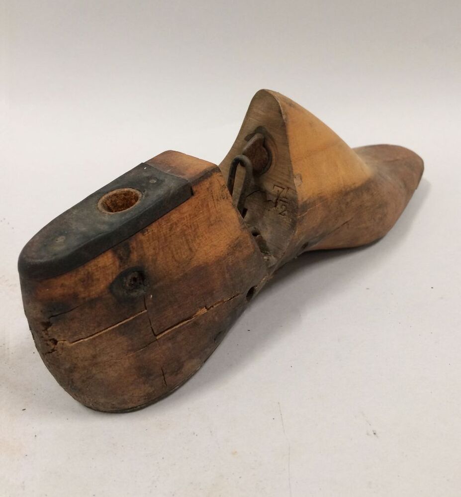 Leest, onderdeel van een paar houten leesten met verend scharnier voor smalle herenschoenen, maat 7,5, hak en teen bekleed met zink