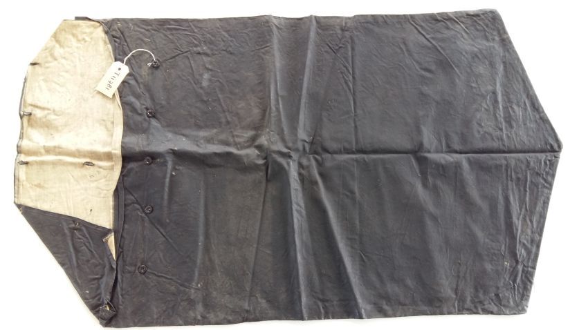 Vaandelhoes van zwart zeildoek met witte binnenkant, klep sluit met gulpknopen en knoopsgaten, onderzijde loopt in een punt uit