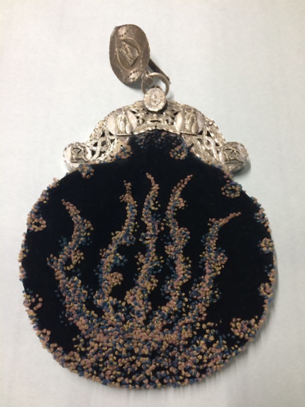 Beugeltas met aan de beugel een ronde zwartfluwelen tas versierd aan beide kanten met wol in blauw, lila en groen
