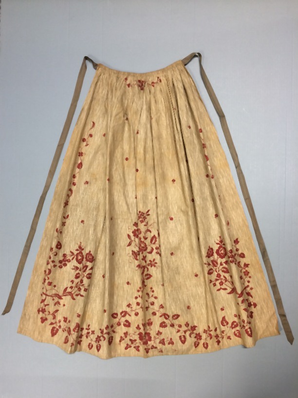 Schort van schortebont, bruin gestreept, versierd met opgedrukte rode bloemen