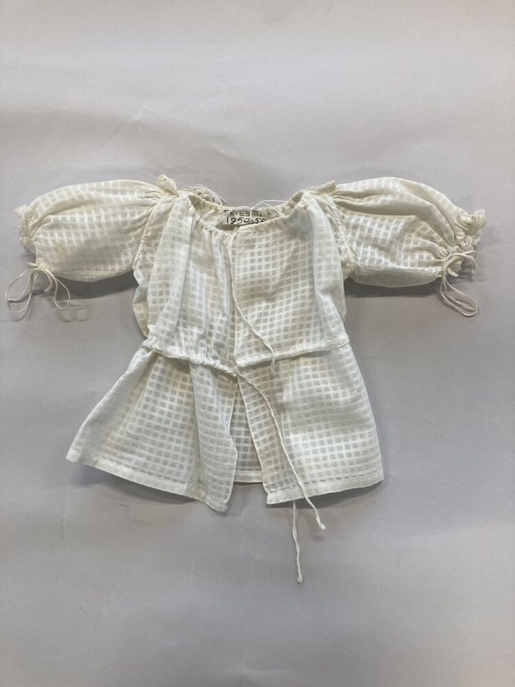 Japonnetje voor baby van witte transparant katoen met ingeweven ruit, afgezet met machinaal kloskant