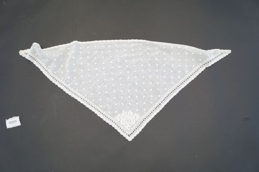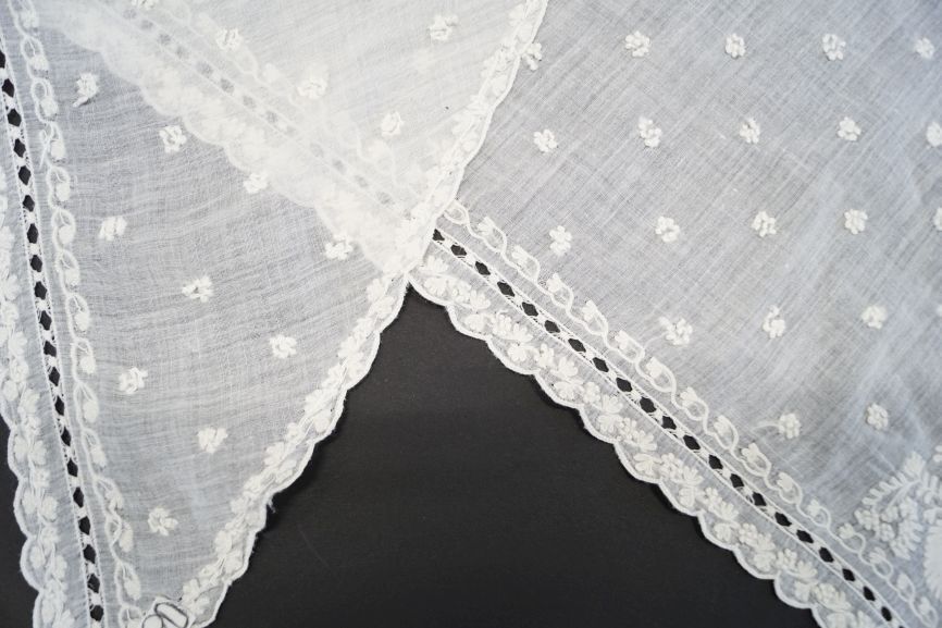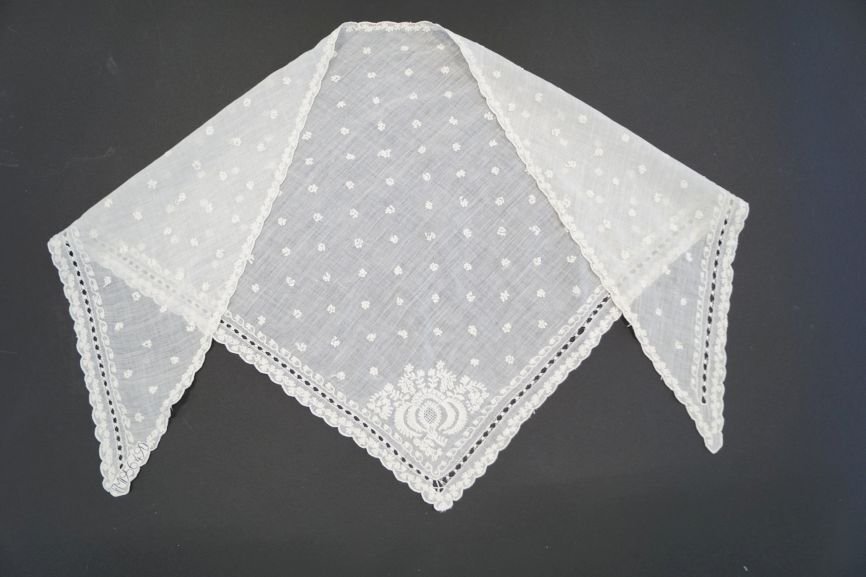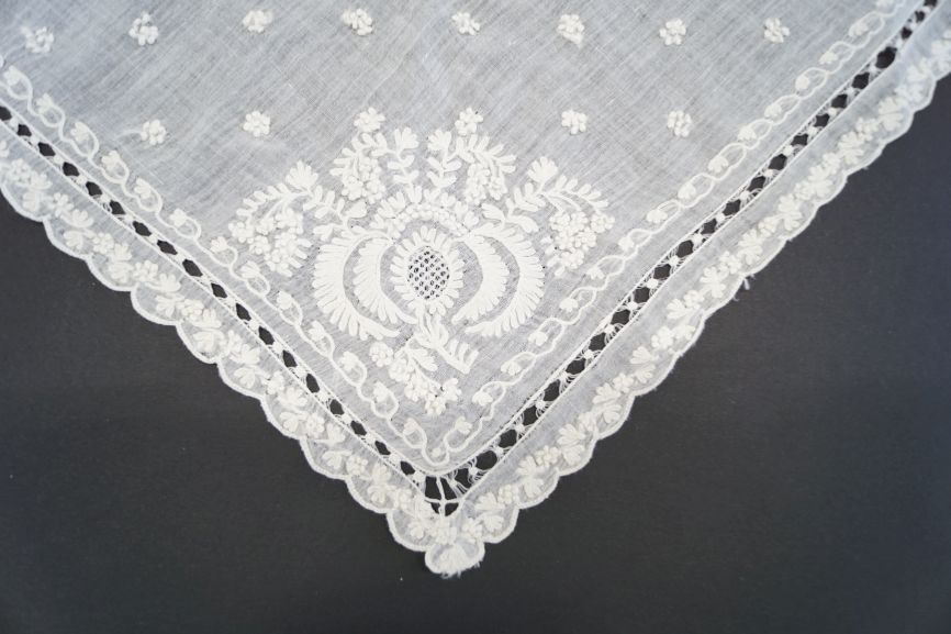 Fijne witte fichu met getamboureerd randje van blaadjes met knoopsteekjes
