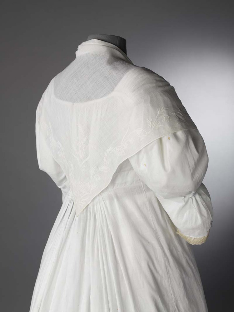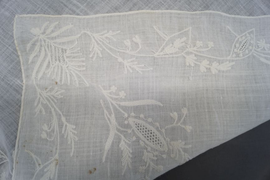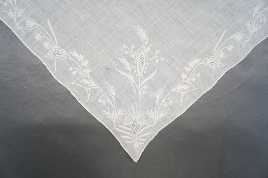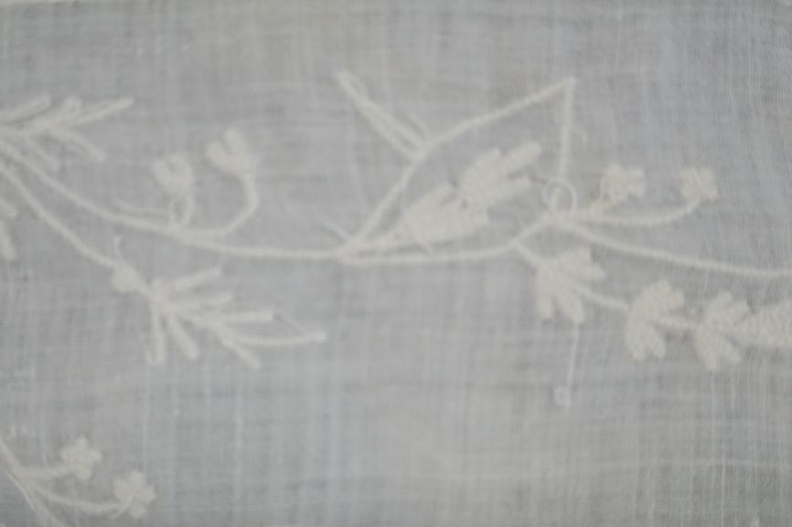 Fichu van witte katoen met rand in tamboureerwerk bestaande uit takjes met bladeren