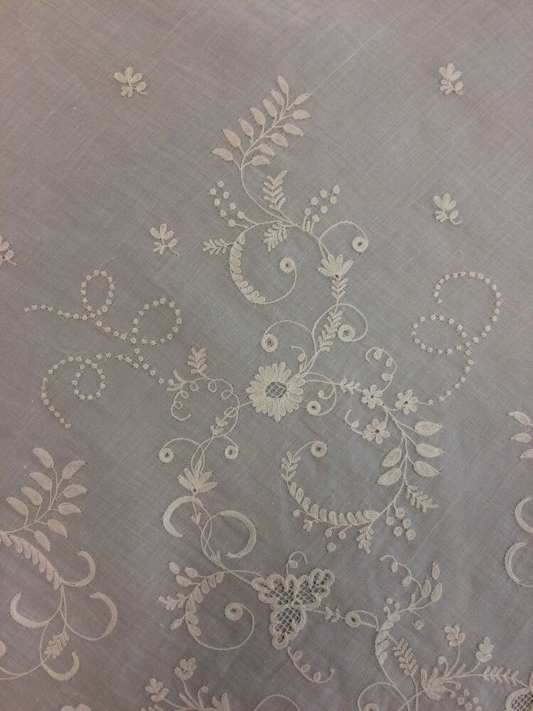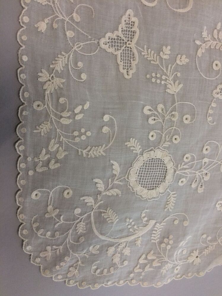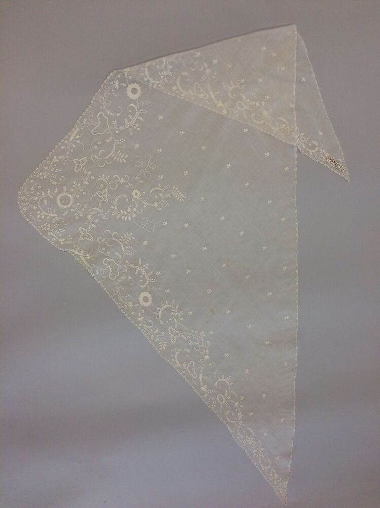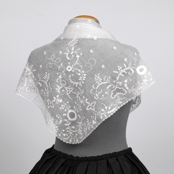 Fichu met verfijnd motief van gekrulde takken en blaadjes in tamboureerwerk met opennaaiwerk