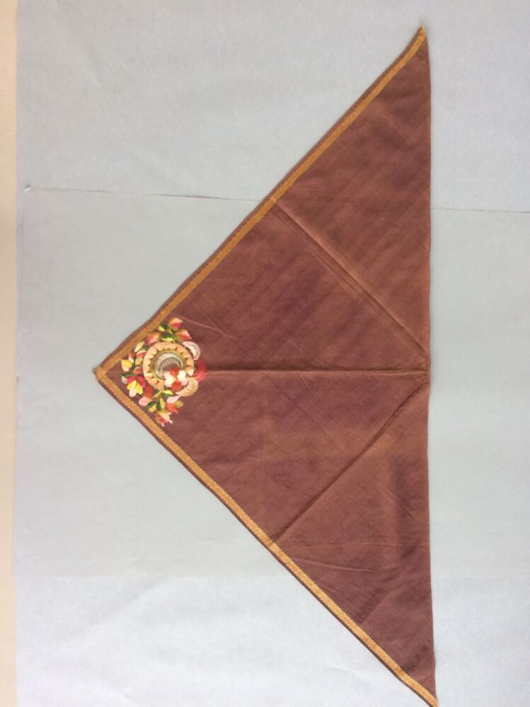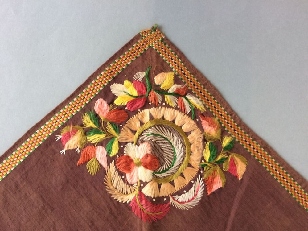Driekante sjaal van paars-bruine zijde met veelkleurg floraal hoekmotief, met rand geblokt in rood, geel, zwart en wit