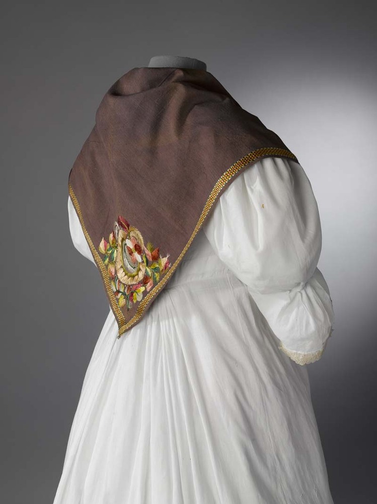 1) hals- of hoofddoek die met een tip (uiteinde) op de rug wordt vastgespeld. https://data.cultureelerfgoed.nl/term/id/cht/00c8692f-af9f-490f-b4ec-ec045b417f30