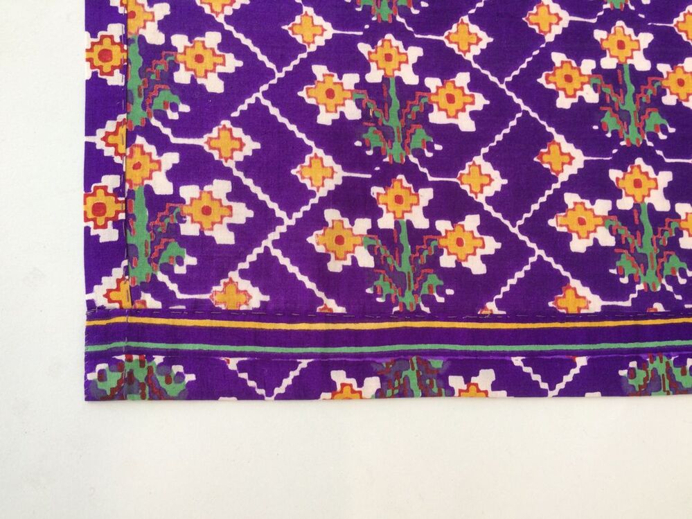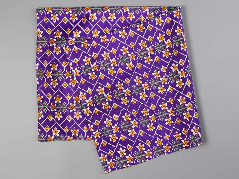 Zijden sjaal bedrukt in de kleuren paars, geel, rood en groen