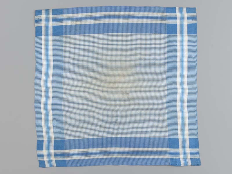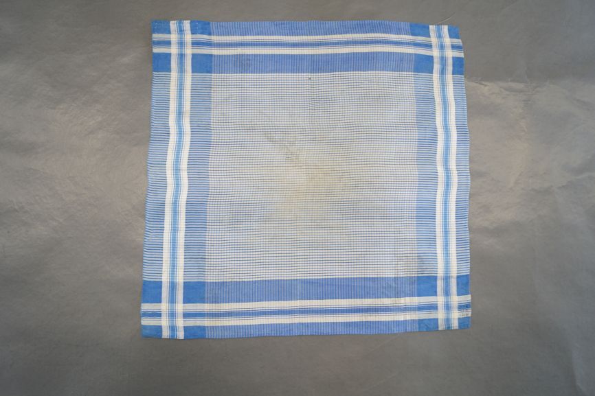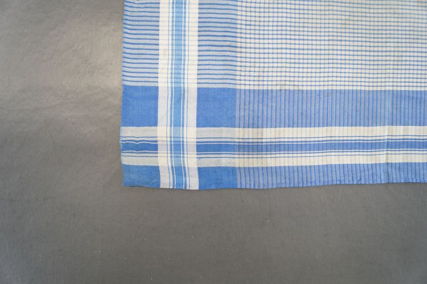 Zijden sjaaltje,geruit in de kleuren blauw en wit, met ingeweven rand