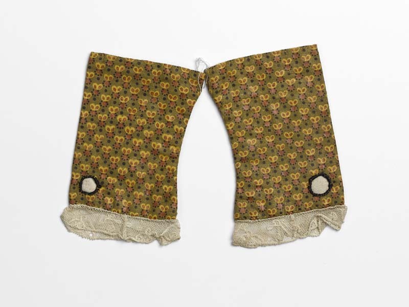 Paar polsmouwtjes van geglansd bedrukte katoen met tule kloskant randje, mosgroen fond met oranje appeltjes met twee blaadjes
