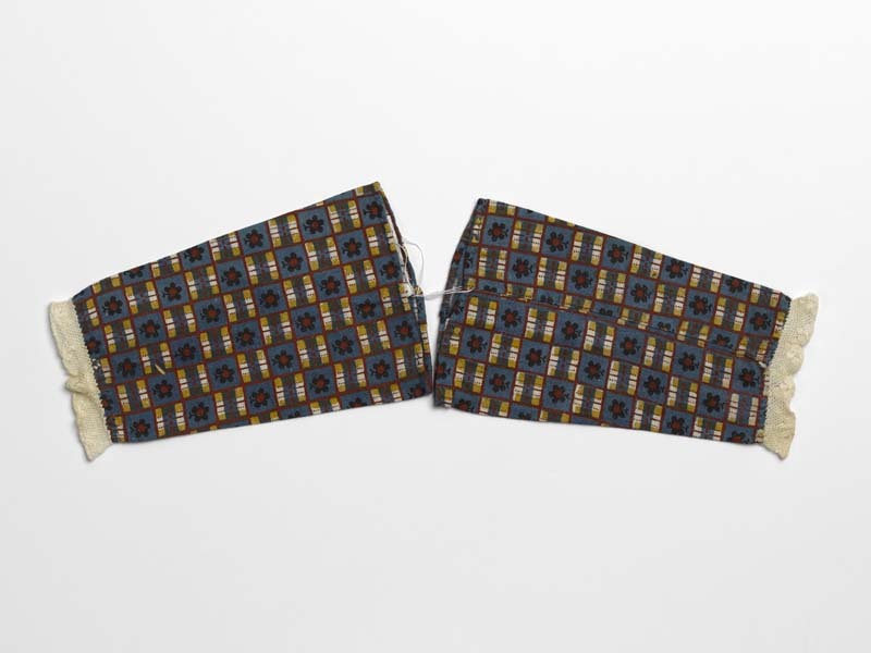 Paar mouwtjes van bedrukte katoen met machinaal kant en tulen randje, geruit bedrukt, rode hokken met blauw fond met zwart bloemetje