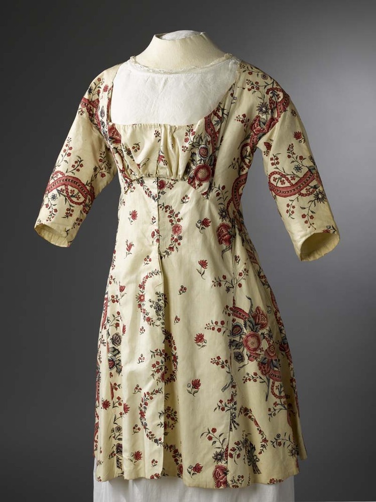 Sitsen vrouwenjak, met hoge taille, beschilderd met afwisselend grote boeketten en kleine bloemetjes tussen slingerende randen op witte grond