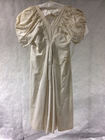 Empire jak met lange schoot, zonder split midden voor en pofmouwtjes van wit katoen met verbleekte geel-bruin floraal strooimotief