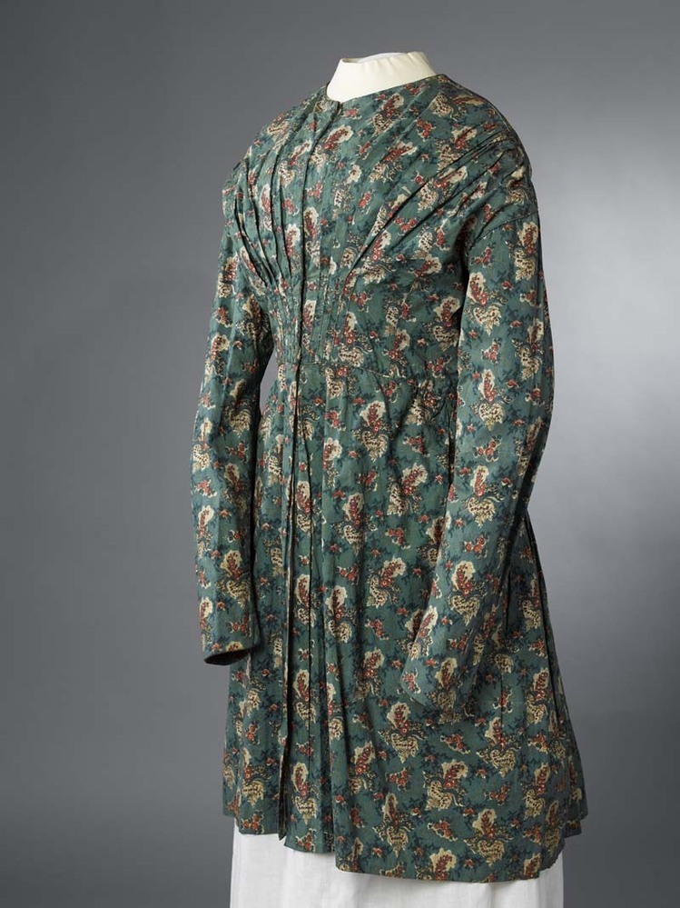 Schootjak van bedrukt katoen met groene grond en beige-rode boeketjes met lange mouwen