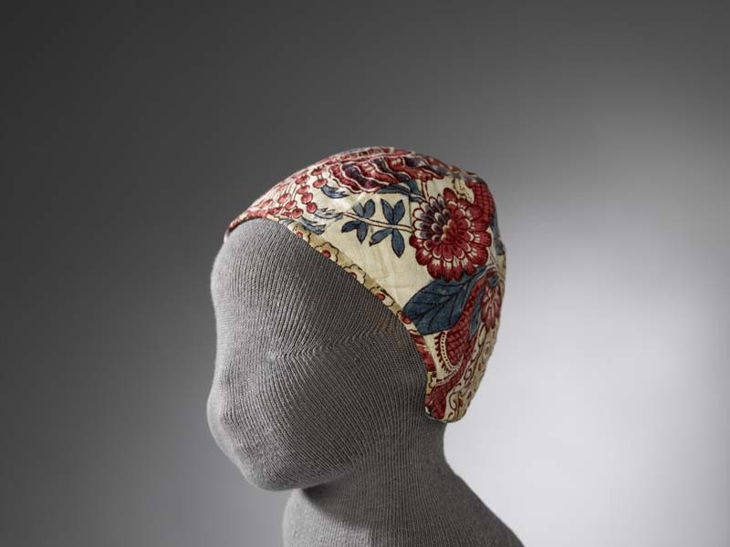 Meisjesmuts, bedrukt in sitsmotief met gestileerde bloemen op witte grond