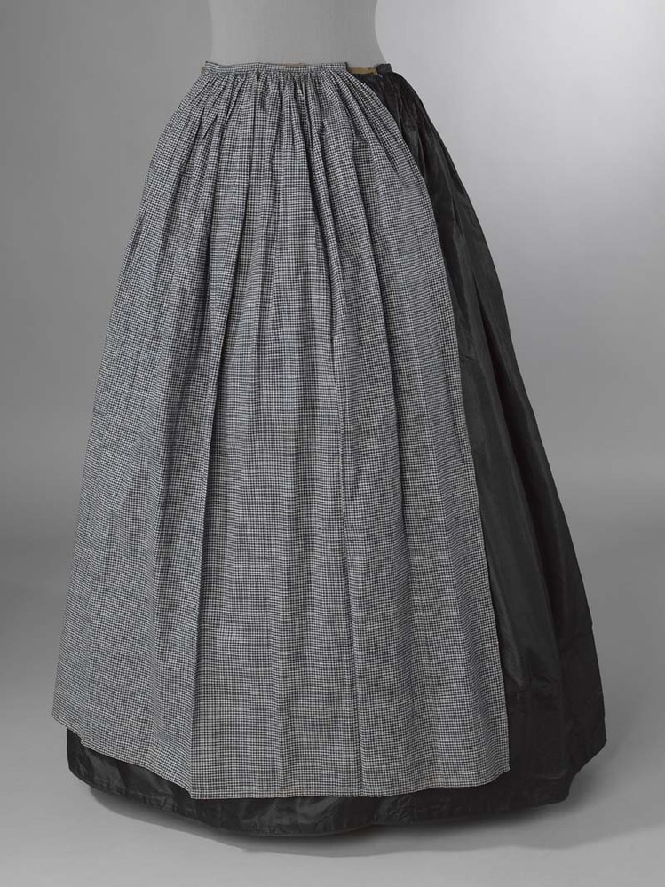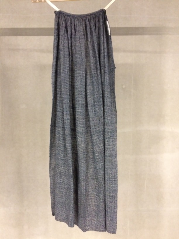 Schort van donker blauw-wit geruit katoen met aan de uiteinden groene wollen keperbanden