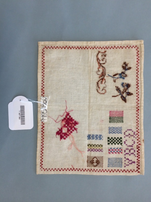 Letterstoplap van katoenen stramien, geborduurd met zijden garen