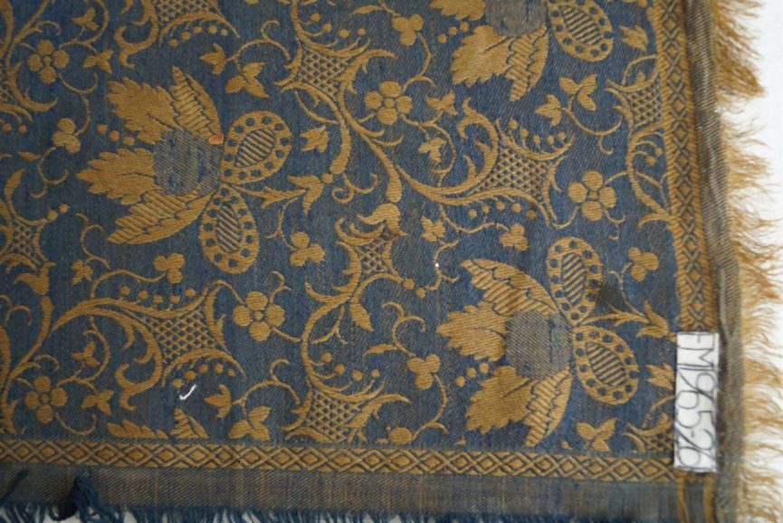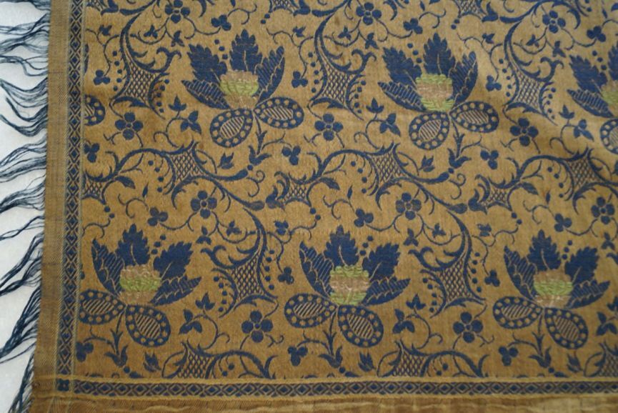 Katoenen sjaal of kleedje met franjerand, bruin fond met blauw bloempatroon