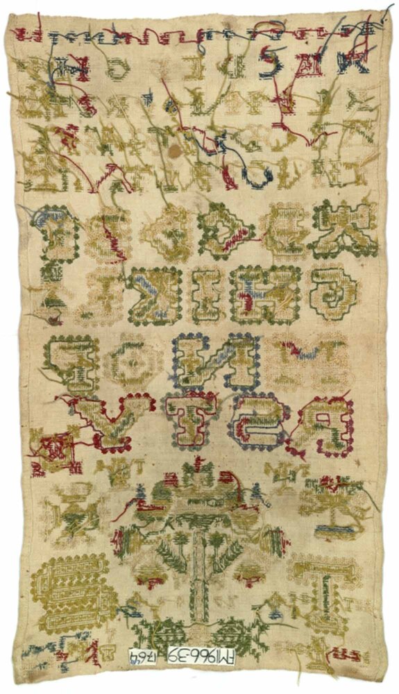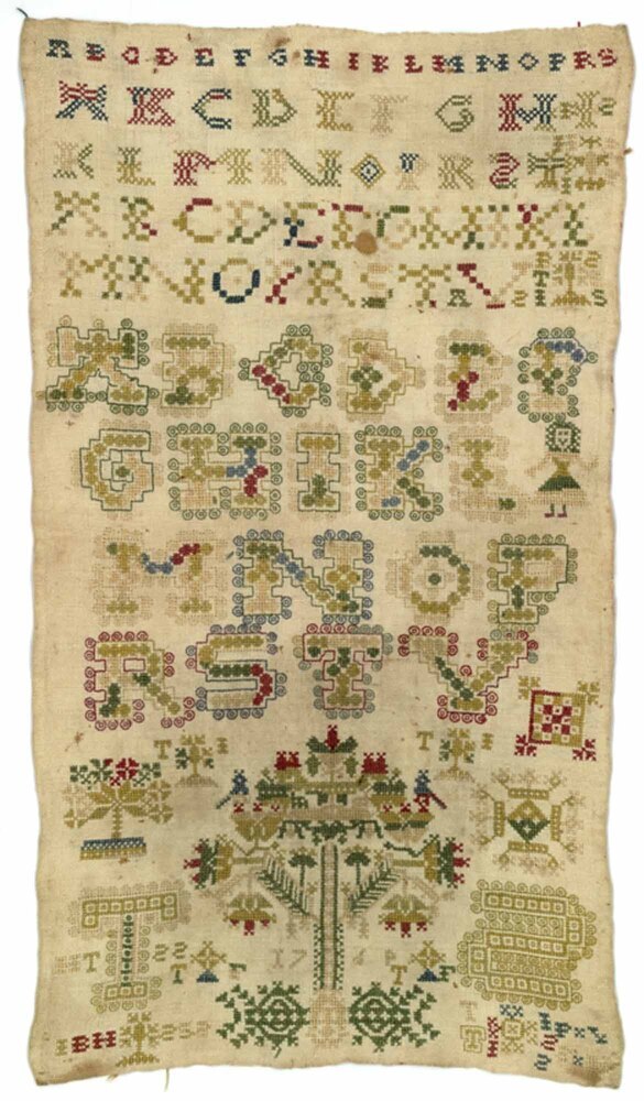 Lettermerklap, met veel groen geborduurd, gemerkt T.S. 1764