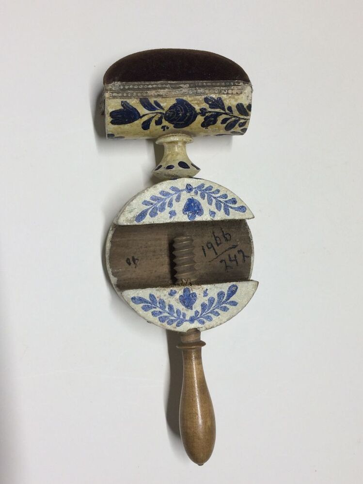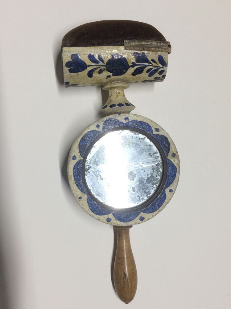 Speldekussen gevat in blauw met wit geverfde houten klemschroef, hierin gemonteerd een rond spiegeltje