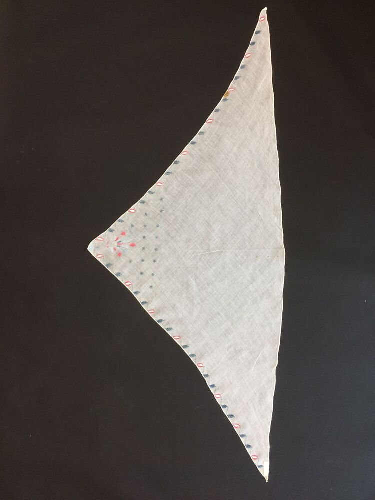 Dunne witte fichu met langs de twee korte zijden een rand van getamboereerde blauwe en rood-witte blaadjes