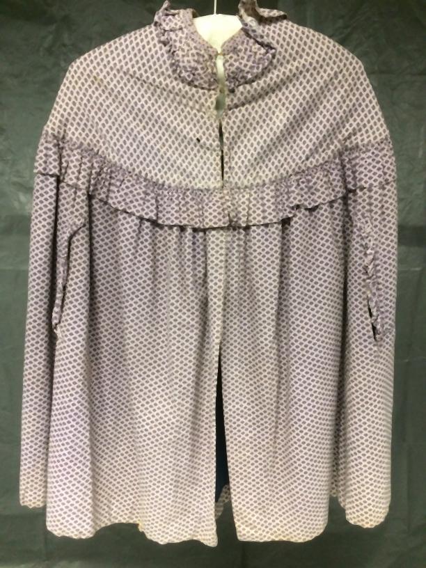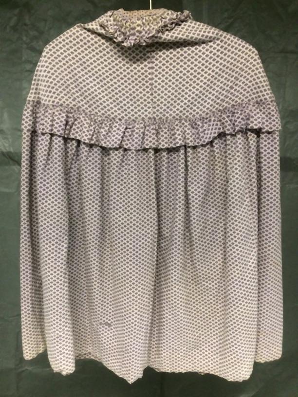 Cape met schouderstuk, van bedrukt katoen met ruitvormig strooimotief, gevoerd met blauwe wol, met platte gerimpeld kraag en strook langs pas