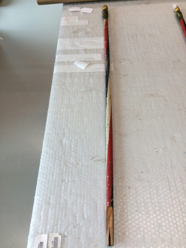 Lange dunne ronde stok naar de punt toe dunner uitlopend. Het boveneinde, de greep, dikker en eindigend in een ge- draaide ronde vergulde knop. Op de greep, die groen is geschilderd, het wapen van Leeuwarden en S.T. II. De stok zelf in rood-wit-blauw beschilderd in schroefdraadvorm