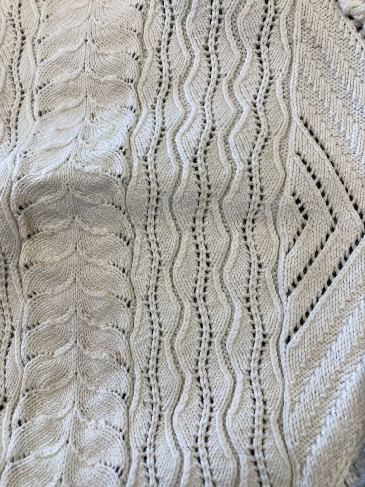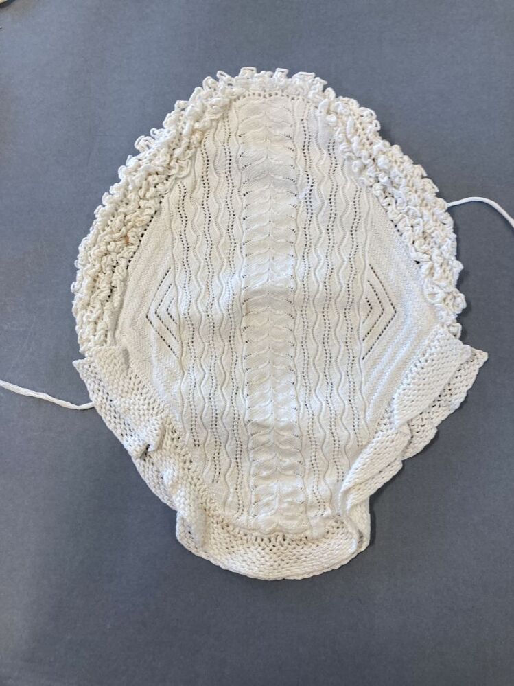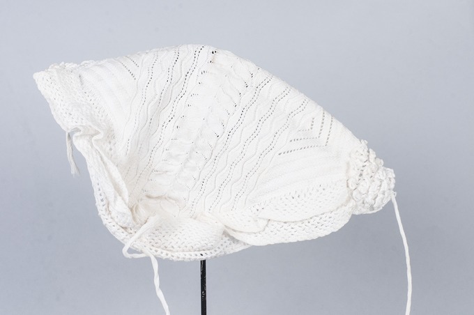 Wit katoenen ajour gebreide muts met twee gehaakte stroken, aan voorzijde hanekam