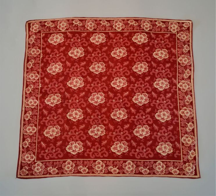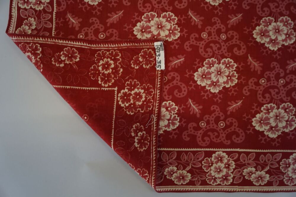 Doek van bedrukte katoen met rood fond en wit met roze primula's
