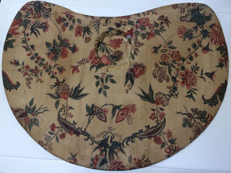 Zonhoed met sitsen voering, beschilderd met symmetrisch motief van diverse bloemranken op witte grond