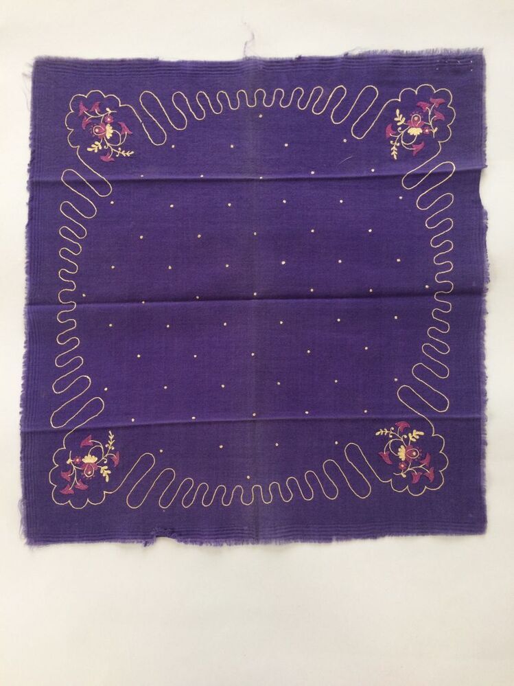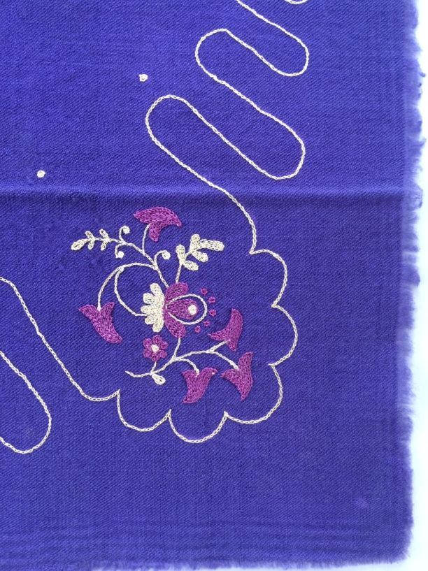 Sjaaltje van paarse wol met getamboereerde motieven en ingeweven rand langs onafgewerkte zijkanten